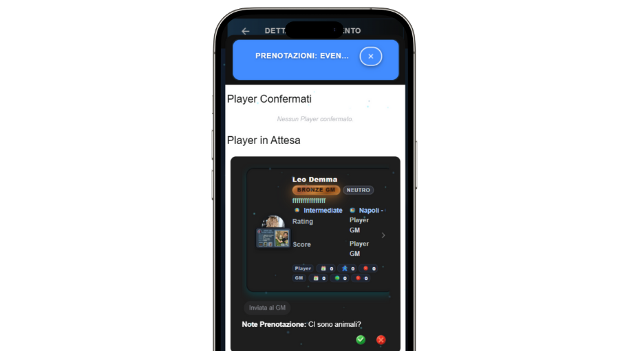 Come GM potresti ospitare persone che non conosci, per questo motivo sei sempre tu a decidere chi può partecipare ai tuoi eventi. In caso di eventi privati in casa, l’indirizzo verrà mostrato solo ai Player accettati, garantendo massima riservatezza. Potrai consultare il profilo, rating, badge e statistiche di ogni Player prima di confermare la sua partecipazione.