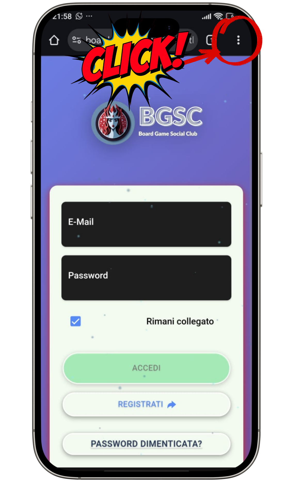 www.boardgamesocial.club e, premi sui tre puntini (⋮) in alto a destra